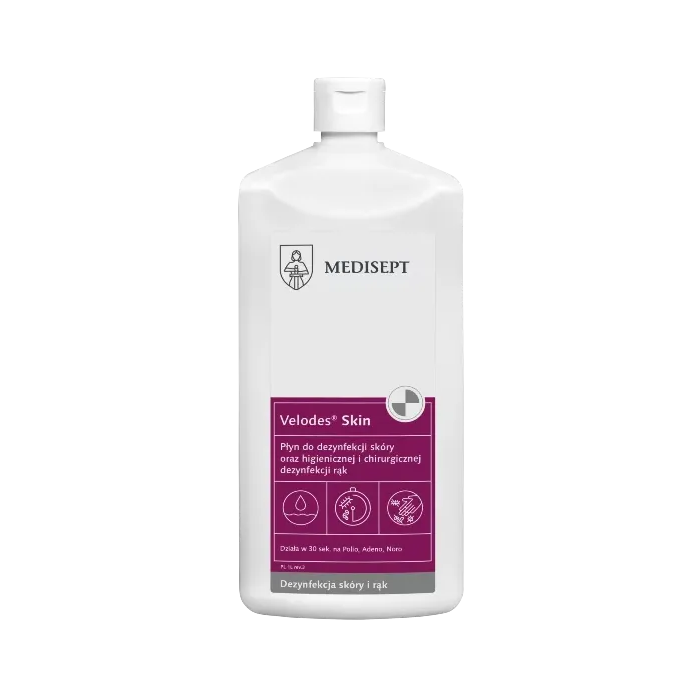 Velodes® Skin to płynny, alkoholowy, gotowy do użycia produkt do dezynfekcji skóry oraz higienicznej i chirurgicznej dezynfekcji rąk o działaniu bakteriobójczym, prątkobójczym, grzybobójczym, wirusobójczym (w tym: HBV, HIV, HCV oraz Adeno, Polio, Noro).